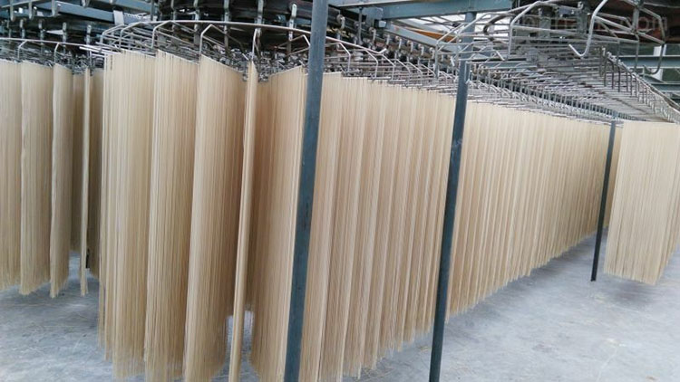 冷卻區(qū):進(jìn)入冷卻區(qū)后,面條的整過制作過程基本完成,面條降溫過快,造成表面溫度過低,內(nèi)部溫度高,內(nèi)部部分水份不易排出,同樣會(huì)造成氣泡粉,也就是常說的花粉,面條也容易爆斷,煮粉的過程中容易斷粉,因此本區(qū)間是一個(gè)溫度遞減的過程,根據(jù)氣候狀況和面條的實(shí)際干濕狀況來控制溫度。